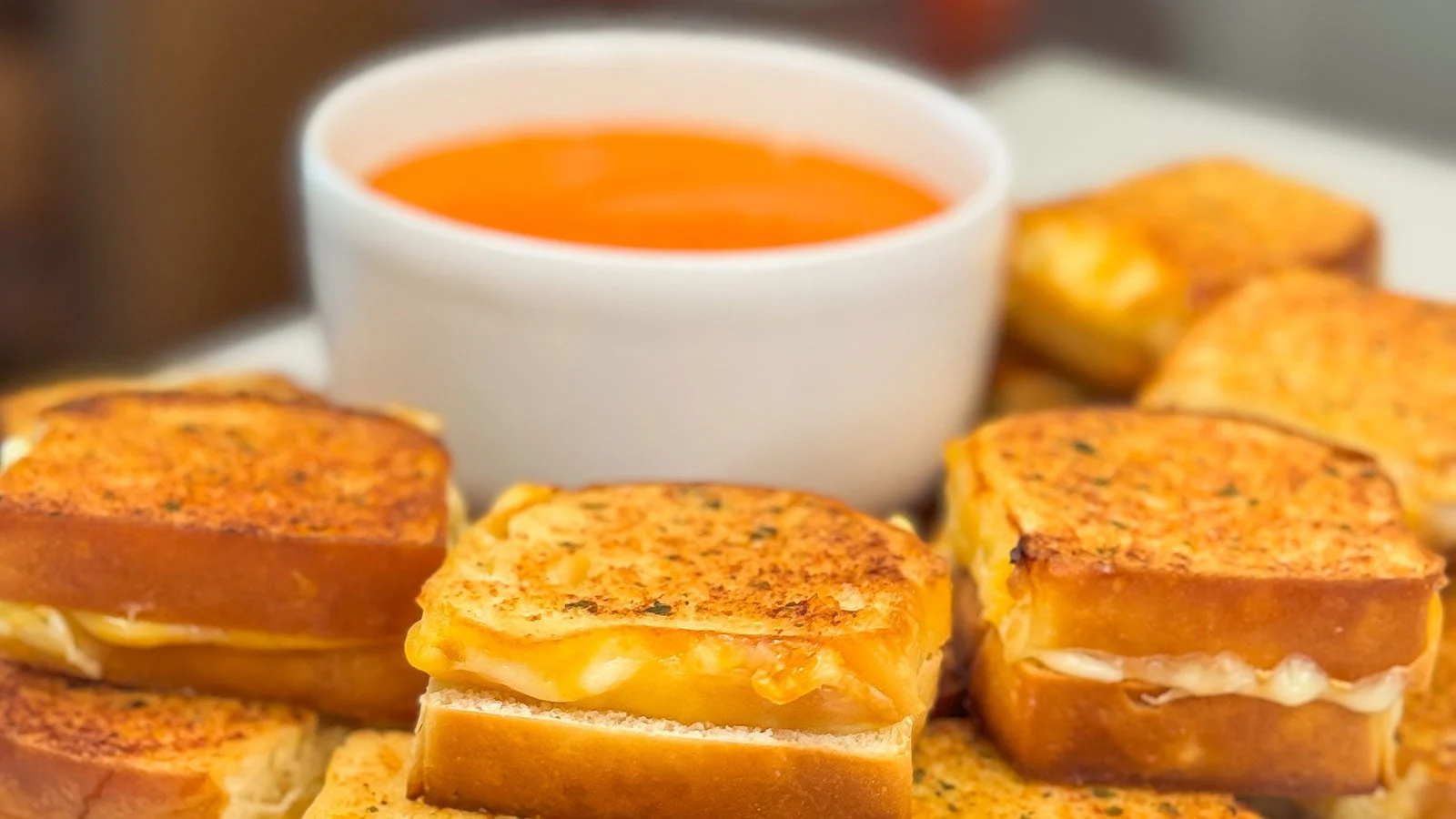 Enjoy mini grilled cheese bites with tomato soup.