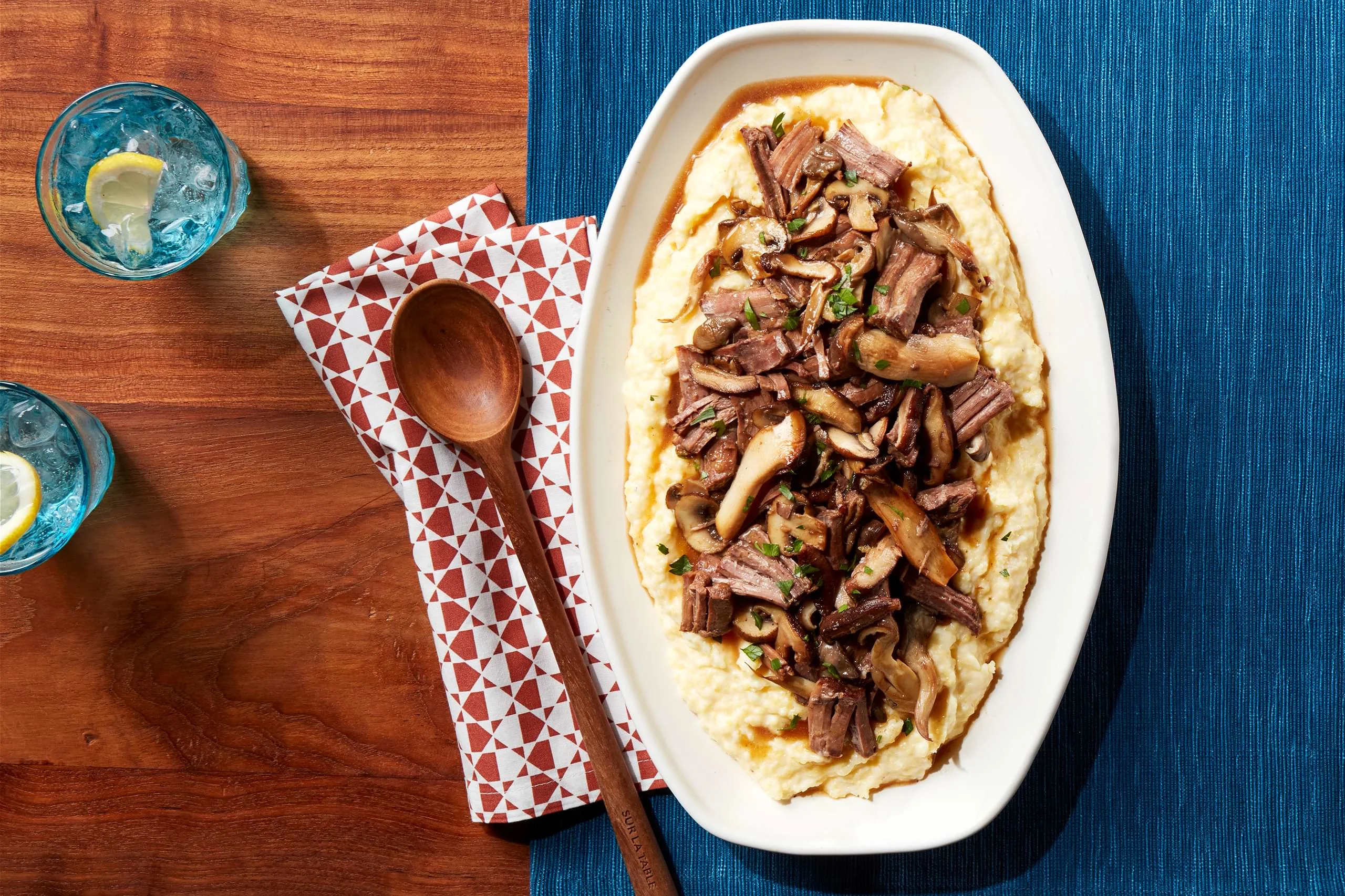 Pour in the beef broth and add the leftover Mississippi beef. Continue to cook, stirring, until beef is warmed through and mushrooms are incorporated. Serve warm, spooned over the polenta.