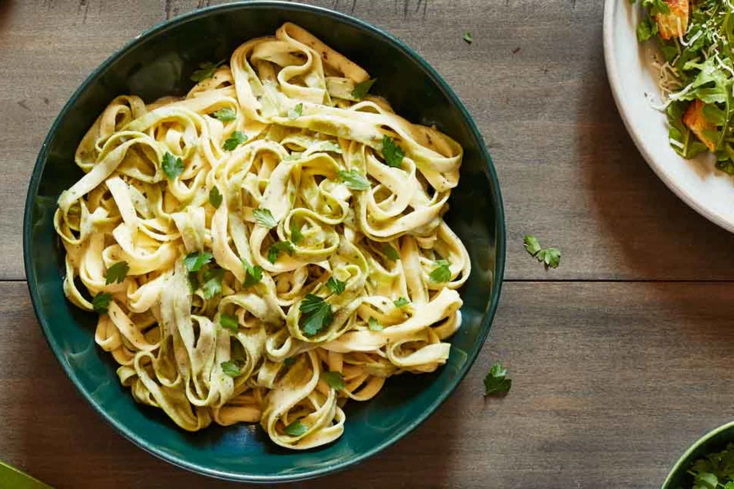 Cook the pasta according to the package directions, drain, and place in a large bowl.