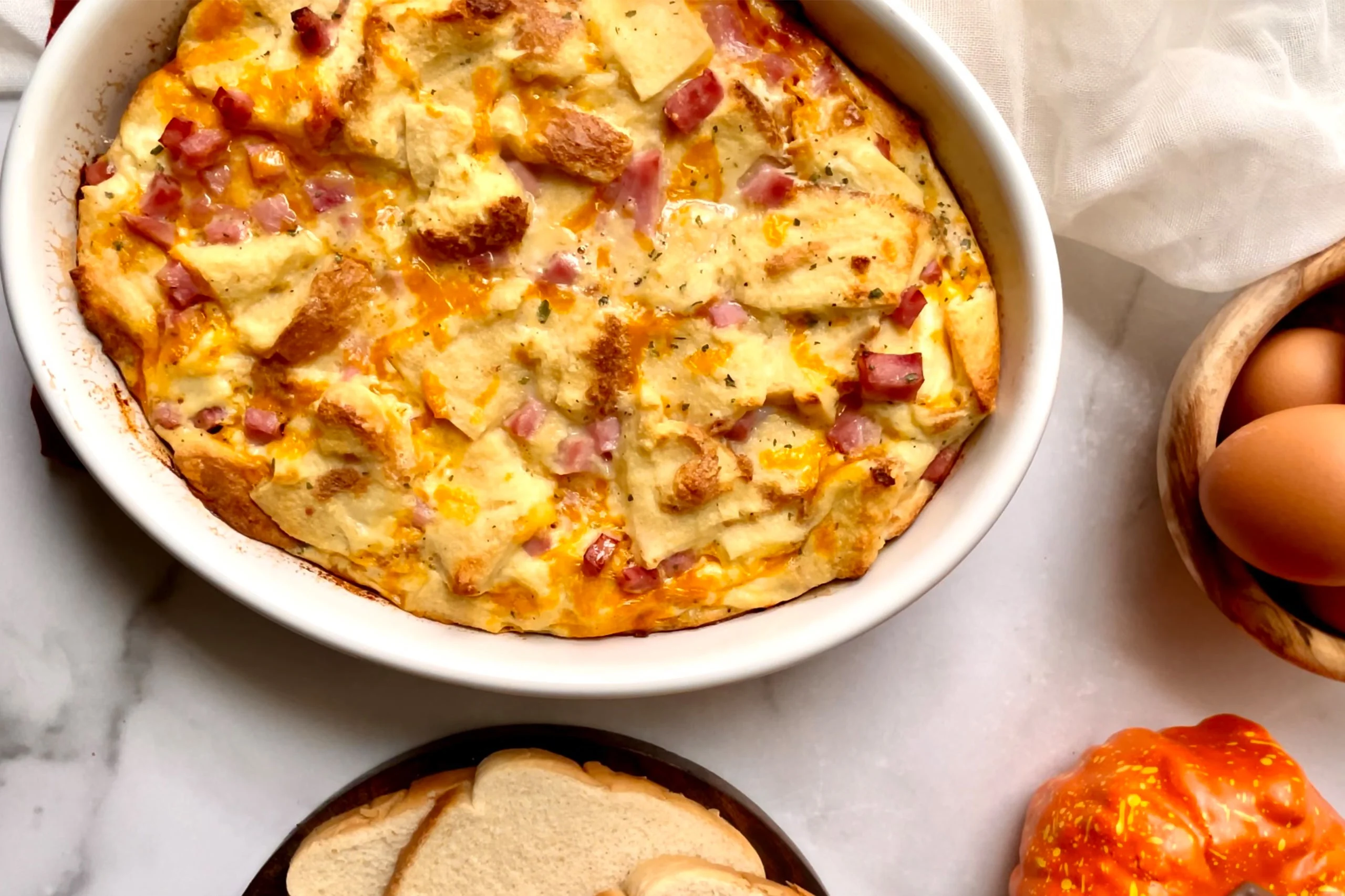 When ready to bake, place in the oven and bake for about 30 minutes, until set and golden on top. Let rest 5 minutes before serving.