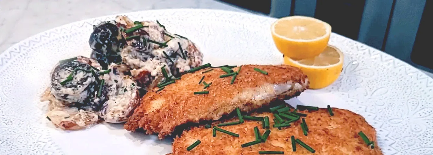 Place each chicken cutlet on a large plate and serve with New Potatoes with Mustard Ranch Dressing. Garnish with chopped chives and serve with a lemon wedge, if desired.