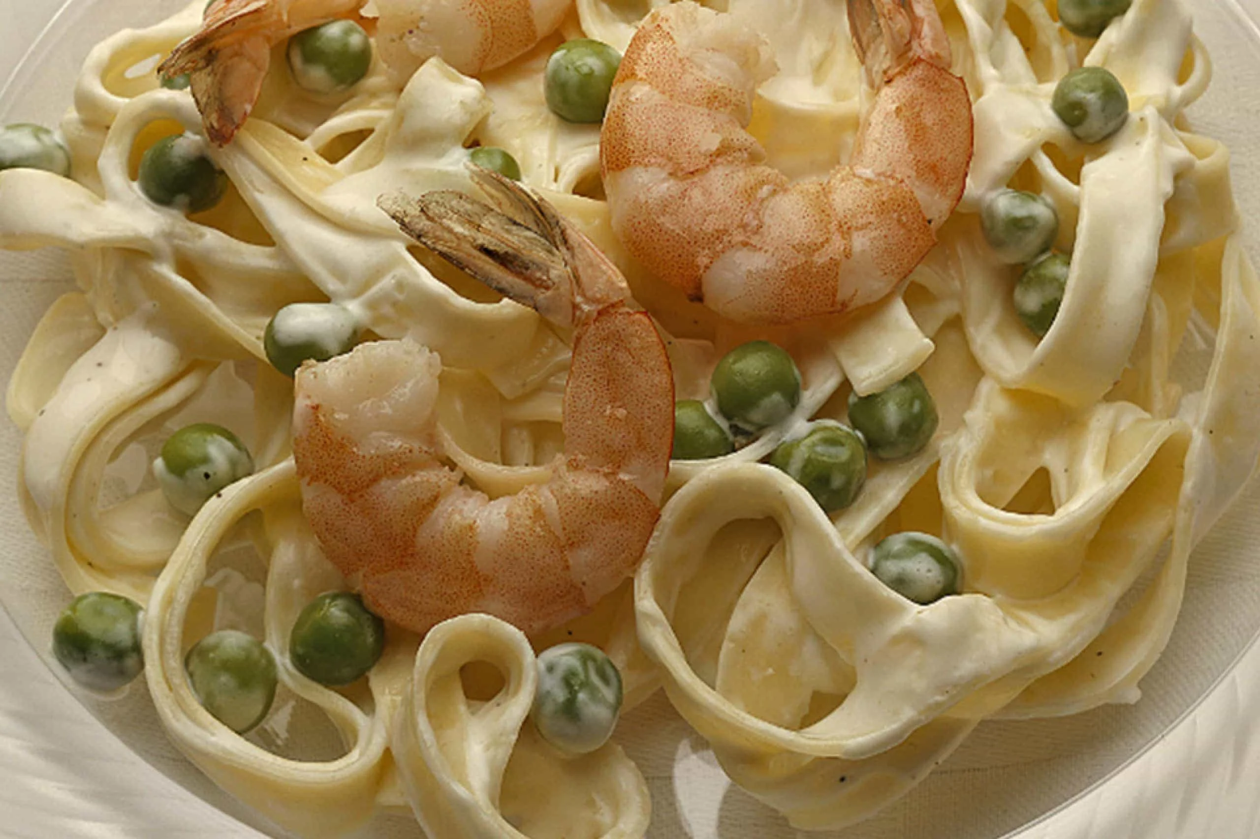 Place the pasta back in pot and toss with the oil until well coated. Fold in the shrimp and peas.