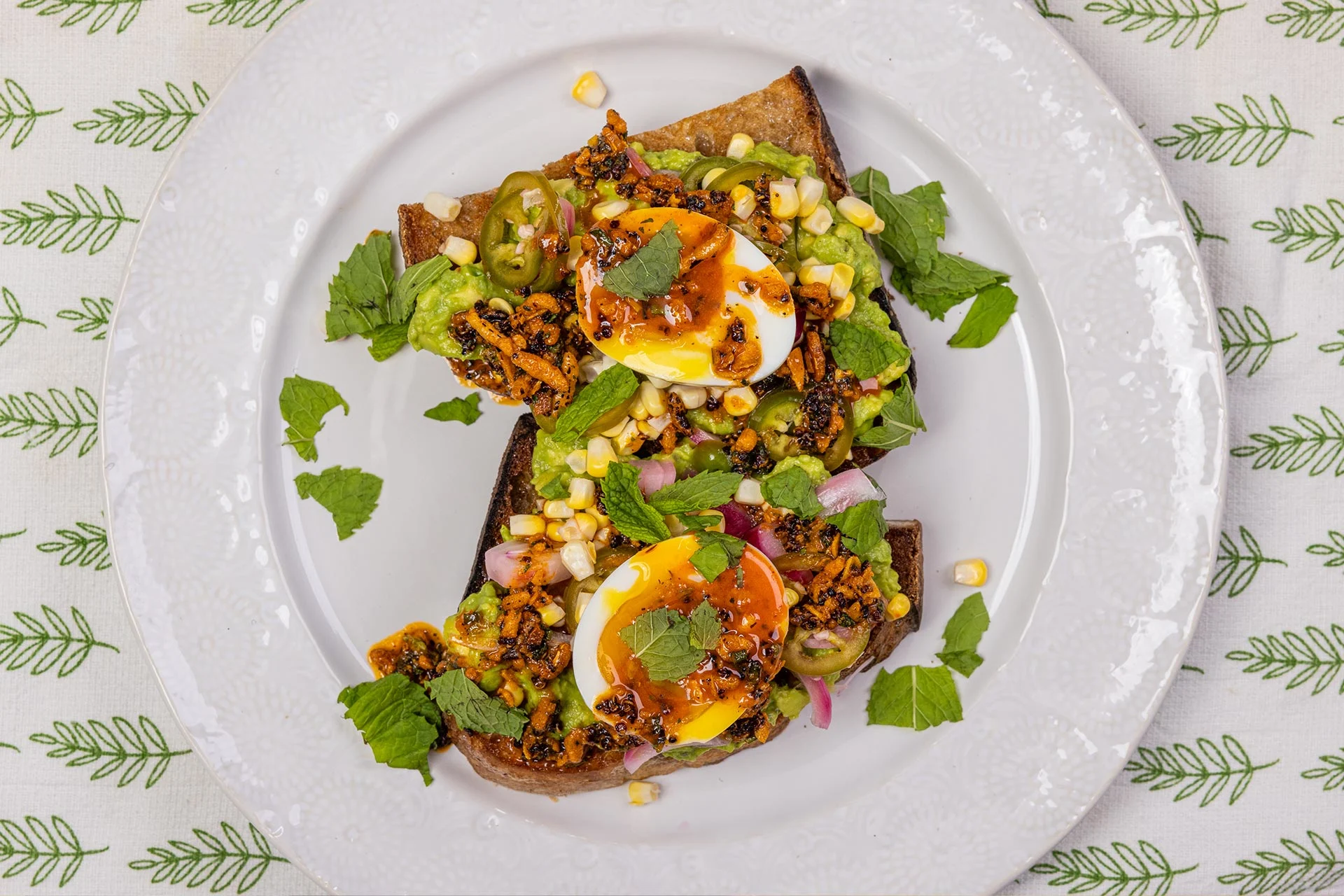 Now, the fun part! On your toasted bread, spread the spicy avocado mash generously. Layer with your quick-pickled vegetables, followed by a sprinkle of Hidden Valley™ Chili Ranch Crunch. For an elegant finish, place the soft-boiled eggs on top, and you're set!