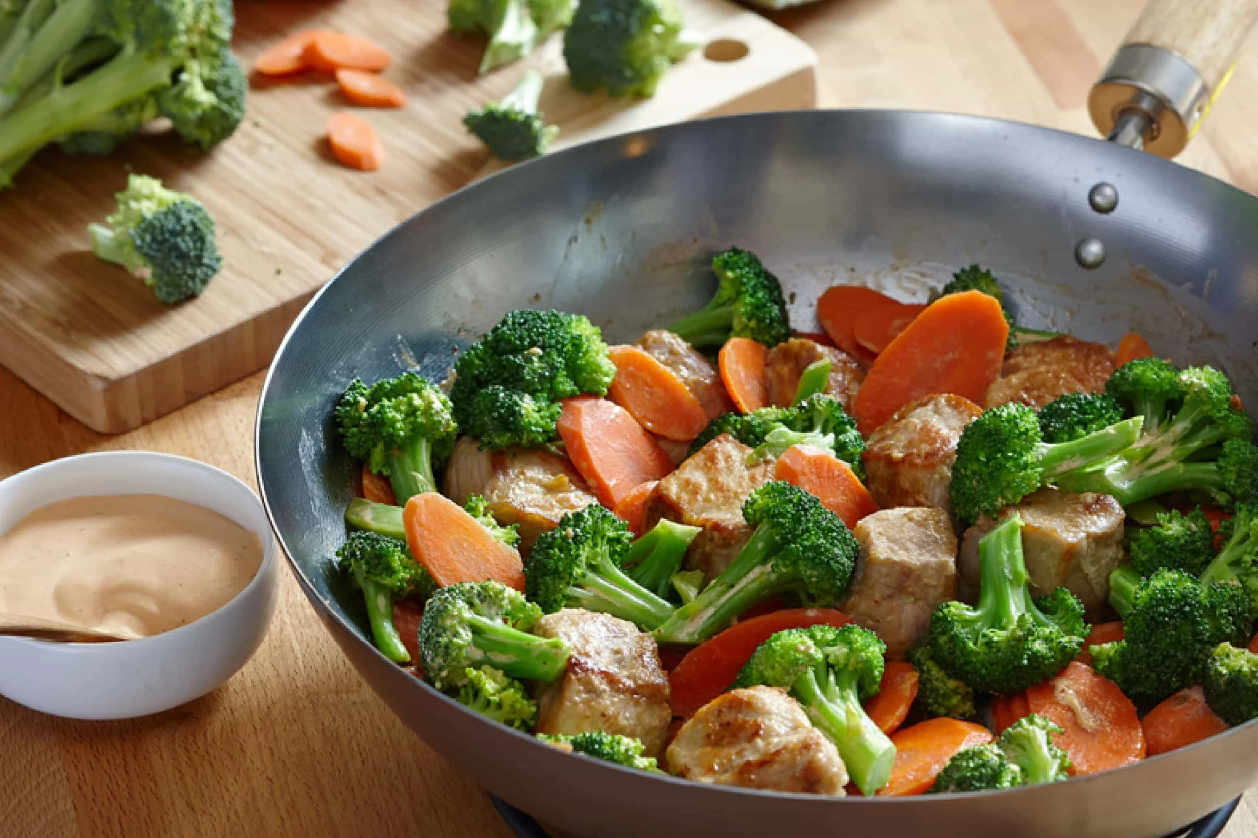 In the same skillet over high heat, stir in the broccoli and carrots and cook until the vegetables have turned bright in color and are still crisp, 3 to 5 minutes.